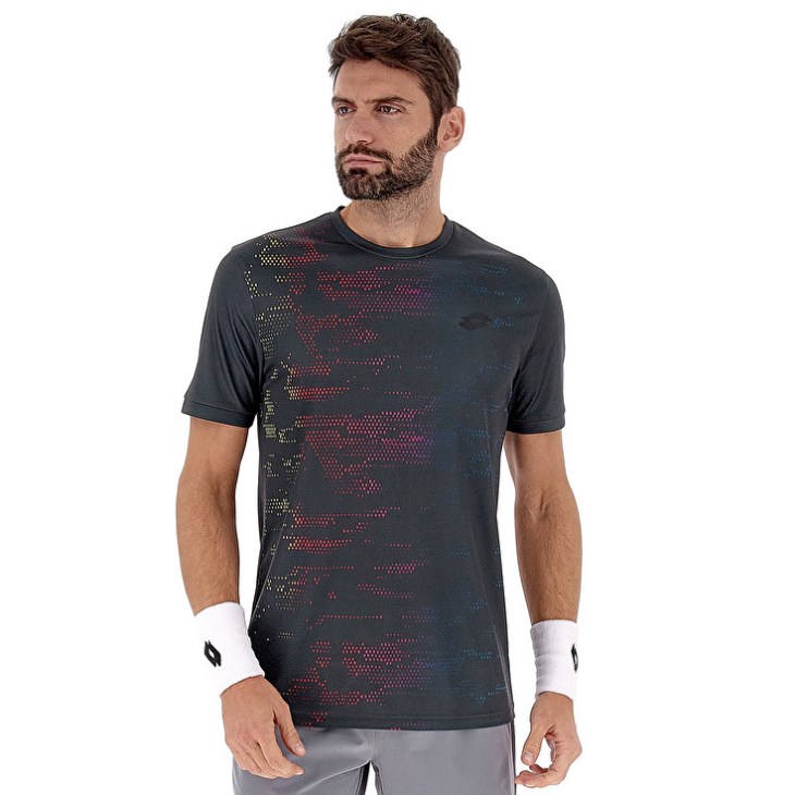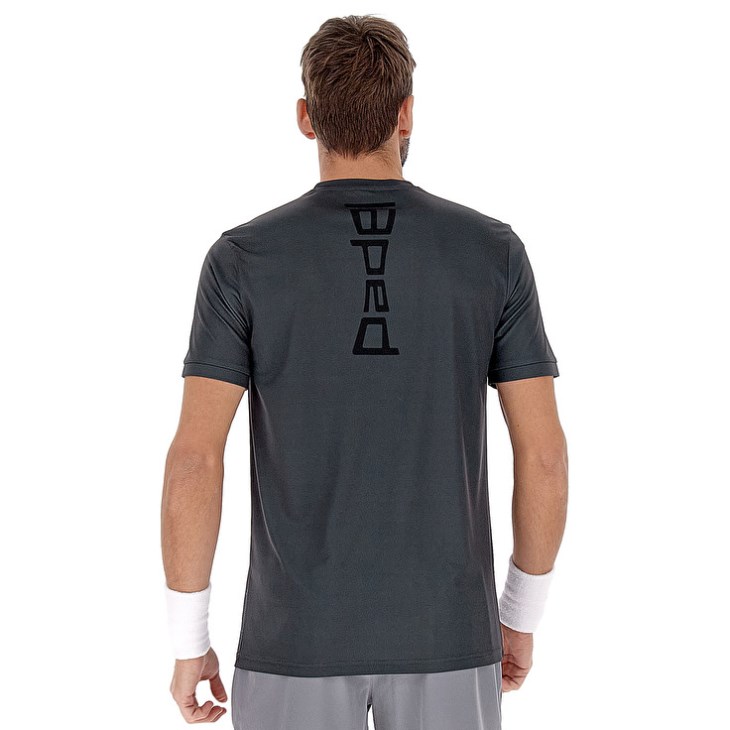 Men's shaped-fit padel t-shirt. This line guarantees high levels of functionality for competitive players of any age and gender, since it includes graphic solutions and colours that are consistent between men and women and are coordinated with the chromatic proposals of the footwear. Particular attention is paid to the design of the products to ensure that they meet ergonomic parameters to facilitate rapid movements, free from constraints. The main features are obtained thanks to the use of specially developed fabrics and to the study of the cuts and the construction of the garments to meet the needs of the game. The products are largely made with the latest generation of recycled materials.